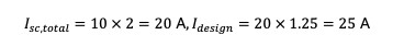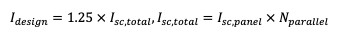 ต่อมาคือการคำนวณ กระแสออกแบบ (Design Current) สำหรับการเลือก OCPD (Overcurrent Protection Device) โดยคูณกระแสรวมของสตริงด้วย 1.25 ตามมาตรฐาน NEC เพื่อเผื่อโหลดต่อเนื่องและความปลอดภัยของสายไฟ